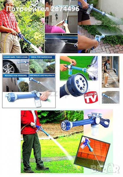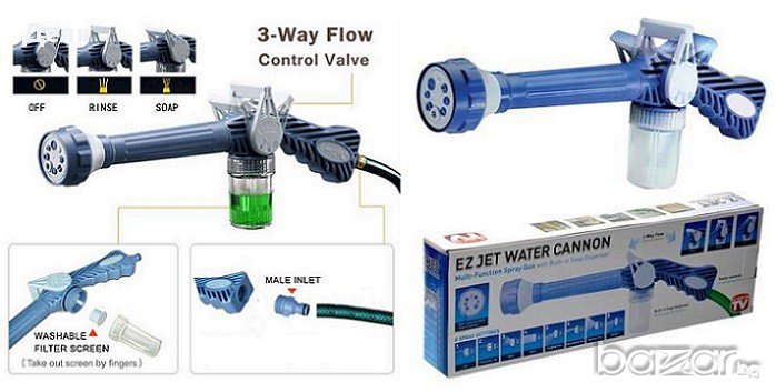 Това е накрайник за маркуч, с пистолет, работещ като водоструйка. Ако не Ви се дават доста пари за водоструйка този накрайник за маркуч ще Ви бъде от голяма полза, защото има абсолютно същият ефект като на професионална водоструйка. Идеален е за почистване на двора, автомобила, високи прозорци, килими и каквото още пожелаете, също така може да се използва и за поливане на градини и трева. Той пасва на всеки вид маркуч. Има контейнер, в който можете да сложите някакъв почистващ препарат, ако искате. Дюзата на накрайника е с 8 различни позиции, така ще можете да си изберете как да настроите струята. Той не се нуждае от някакво захранване.