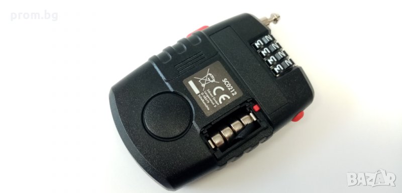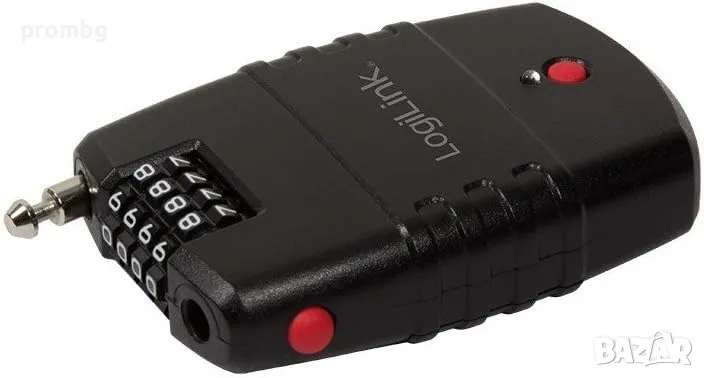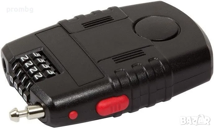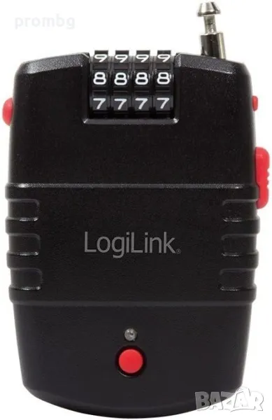 катинар с аларма, код 4 цифри, LogiLink, Германия. 4 цифреният код позволява 10000 комбинации, максимална сила на алармата е 90 dB. Алармата се активира при движение или срязване на свързващия кабел. Батерията може да се премахне само при използване на правилна комбинация. Възможност за настройване на чувствителността на алармата. Дължина на кабела 2 х 600 мм, размери 66 мм х 25 мм х 91 мм, тегло 60 гр. Работи с 4 батерии LR44 ( вкл.)