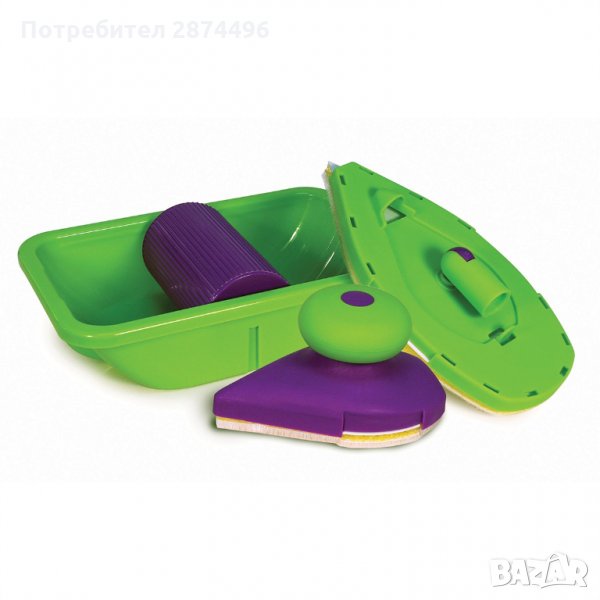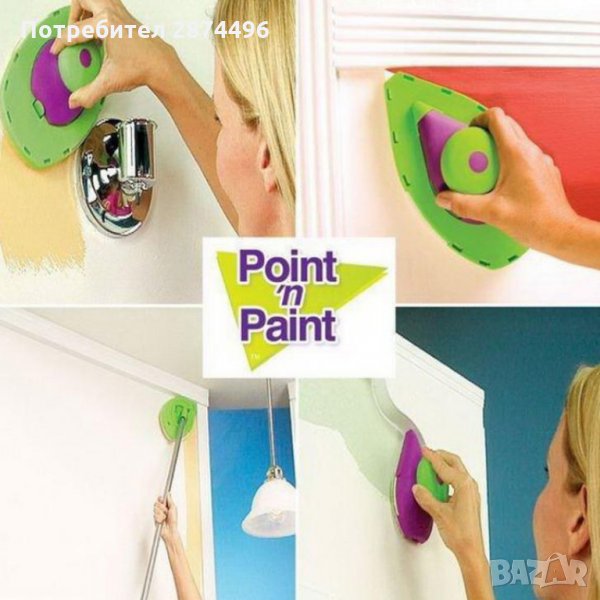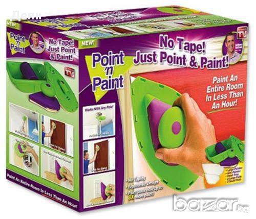 POINT AND PAINT e най-новият високотехнологичен и хитър помощник на домашния бояджия. Комплектът е съставен от 2 "валяка" - дунапренени четки с форма на ютия, които много удобно боядисват постранството до ъгъл без помощта на тиксо и помощни материали. ПРОСТО ОТСИЧАТ без да внимавате, без опастност от теч, подливане или изцапване на тавана. Двете "четки" поемат нужното количество боя от специално констроираната роторна ваничка, която разпределя перфектно съдържанието и количеството боя по четката. Голямата "четка" има чупещо във всички посоки рамо за завиване на удължител (не включен в комплекта).