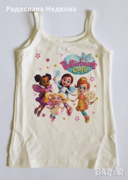 Страхотен памучен комплекът бельо за момиче - потник с тънки презрамки с апликация на Масленка отпред и бикини. Налични размери - 98,104,110 и 116 см.