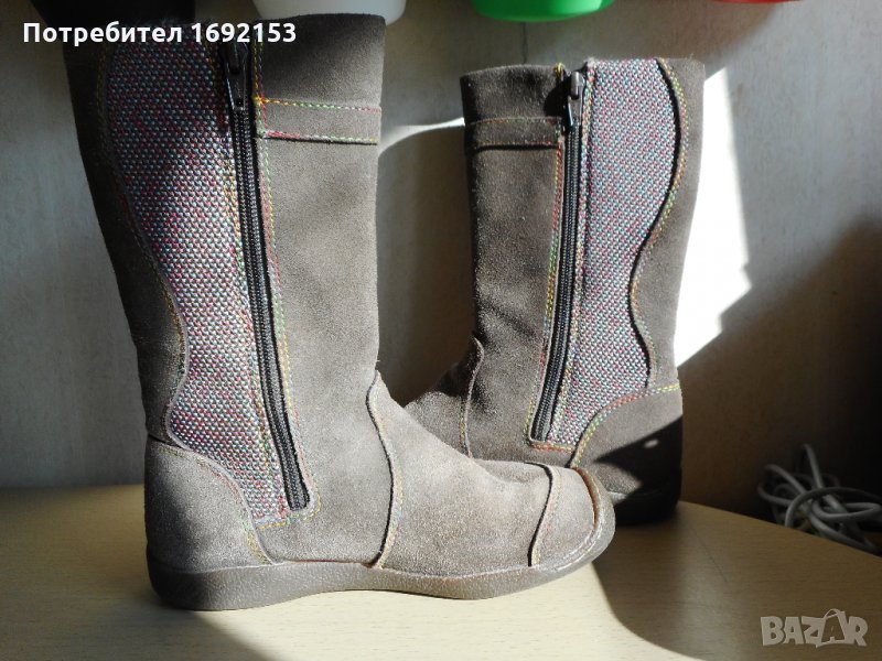 Водоустойчиви ботуши от висококачествен естествен велур и текстил на американската фирма KEEN за момиче № 34. Стилни, елегнтни и с детски елементи - пъстри преливащи цветове на конците, с които са шити. Имат цветна филцова ивица, осигуряваща дишане и предпазваща от запарване на крачето. Лесно и бързо се обуват с дълъг цип от вътрешната страна. Подметката е от здрав и мек материал. Изключително са удобни!