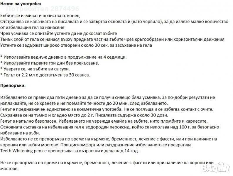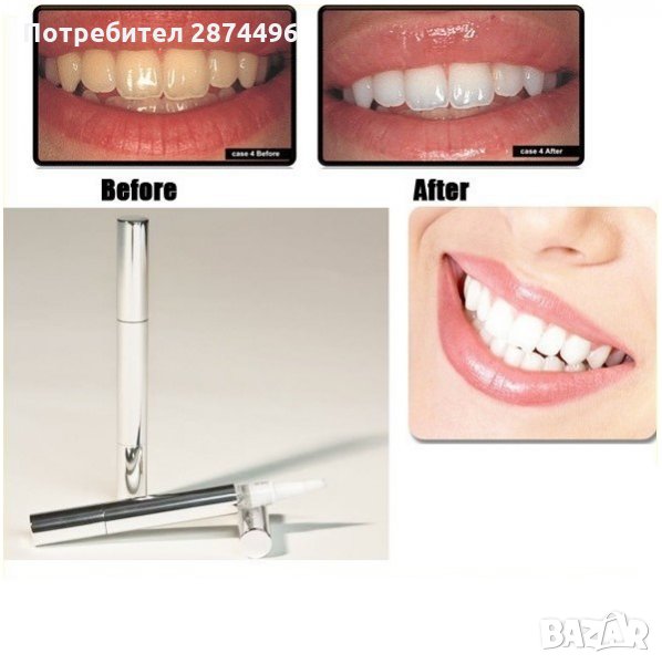 Мечтаете за прекрасна и бяла усмивка? Превърнете мечтата си в реалност с Teeth Whitening Pen – писалка за избелване на зъби . Писалката е напълно безвредна и няма да увреди емайла ви нито евентуални пломби или кариеси. Тайната за добрите резултати се крие в основната съставка на Teeth Whitening Pen – водородния пероксид, който е безопасен за вашите зъби. Резултатите са удивителни, а бюджета ви ще се възстанови бързо. Отстранете зъбната плака и всички причини за пожълтяване на зъбите.Начин на употреба:Зъбите се измиват и почистват с конецОтстранява се капачката на писалката и се завъртва основата ѝ (като червило), за да излезе малко количество от избелващия гел за нанасянеЧрез усмивка се опитайте устните да не докосват зъбитеТънък слой от гела се нанася върху предната част на зъбите чрез кръгообразни или хоризонтални движенияУстните се задържат широко отворени около 30 сек. за засъхване на гелаПрепоръки:Избелването се прави два пъти дневно за да се получи сияещо бяла усмивка. За по-добри резултати не изплаквайте, не се хранете и не поемайте течности до 20 мин. след избелването.Гелът е предназначен единствено за козметична употреба. Не се поглъща и се избягва контакт с очите. Съхранява се на тъмно и хладно място до 2 г. Писалката съдържа около 30 дози.Гелът е напълно безопасен. Избелването не уврежда емайла на зъбите, нито пломбите и кариесите. Основната съставка на избелващия гел е водороден пероксид, който се използва над 100 г. за безопасно избелване на зъби.Избелването не се препоръчва по време на кърмене, бременност, лечение с фасети, или при наличие на коронки или зъбни мостове. При дискомфорт или раздразнение избелването се прекратява.Тееth Whitening pen се препоръчва за възрастни и деца над 14 год.Не се препоръчва по време на кърмене, бременност, лечение с фасети или при наличие на корони или мостове.