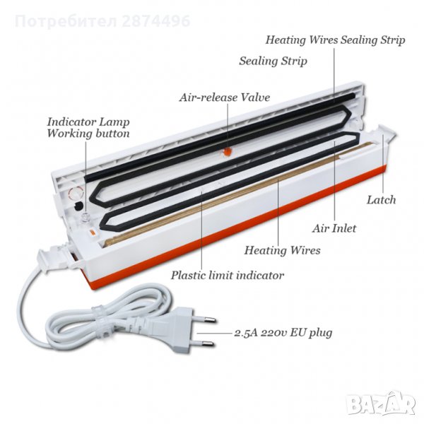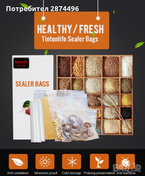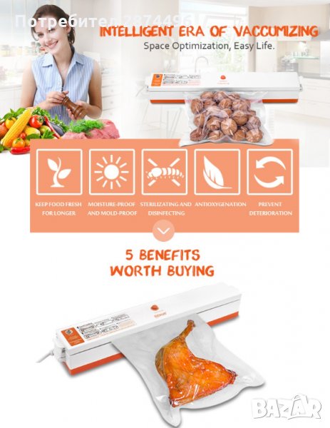 Описание:Уред предназначен за вакуумиране на храна. Постига се невероятен ефект, свежестта и качеството на храната се запазва за до 3 пъти по-дълго време. Вакуумирането като процес, премахва излишния въздух и удължава свежестта на храната, която съхранявате в хладилник или фризер. Подходящ и за запечатване на различни зърнени и житни култури, ядки, семена, суперхрани и много други, за перфектното им съхранение и предпазването от навлажняване и гранясване (при съхранение в хладилник). Храната, съхранявана във вакуумирани пликове, се предпазва от поемане на аромати и миризми на други храни.