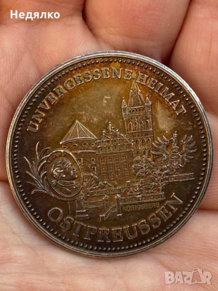 Перфектен,много рядък,състояние от снимките.25,75 грама,40 мм диаметър,дебелина около 2мм,чисто сребро,999...В никакви наши и чужди водещи сайтове го няма,възпоменателен.Не пропускайте да притежавате този уникат,още повече ,че на 22 април се навършват 300 години от рождението на Имануел Кант!Има и фабричен дефект, двоен удар от матрицата,двойно изображение на буквите "PREUSSEN",ясно се вижда.