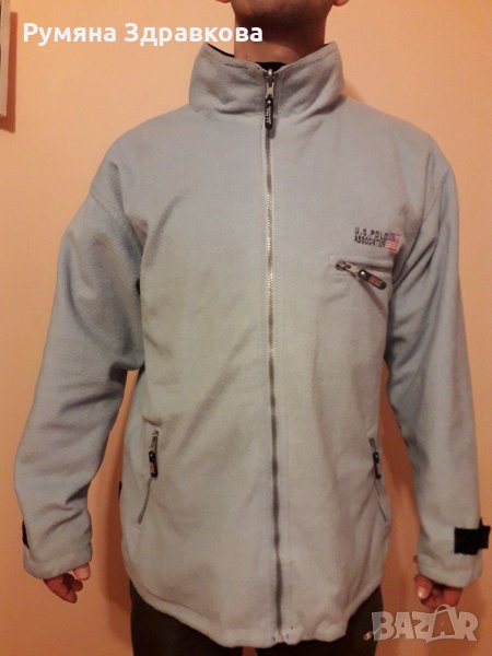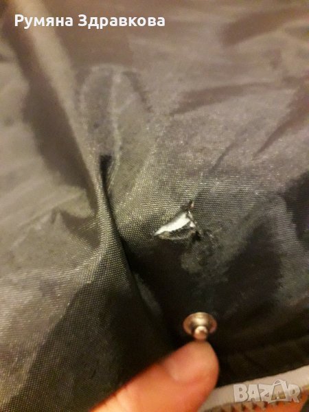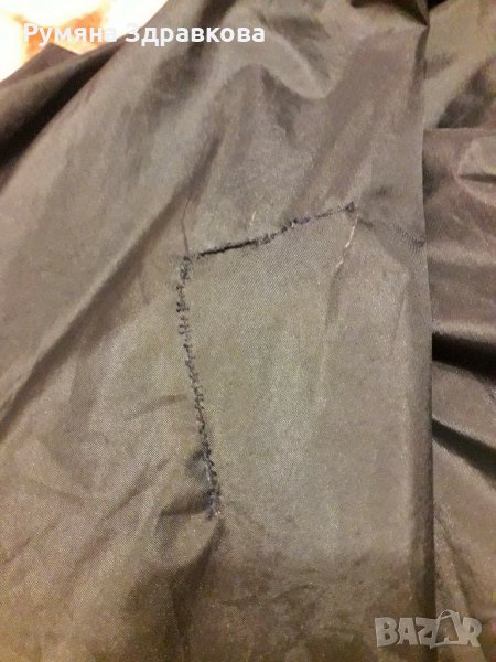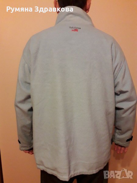 Якето е с две лица, от едната страна е черен шушляк, от другата - син полар. Якето има забележки само от шушляковата страна, на последните две снимки се вижда, зашито на единия ръкав, което не се забелязва много и съвсем леко скъсано отпред до копчето. Якето е с цип и копчета. Якето е доста голямо, или е 2XL, или 3XL. При интерес ще дам точни мерки.
