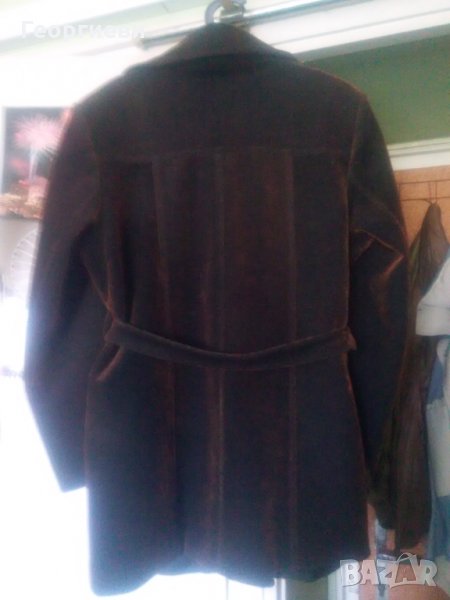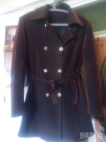 Продавам горна/връхна дреха- двуредно сако/манто, с подплата, леко блестяща материя, тъмно червеникавокафяв цвят, с колан, със златисти копчета, с 2 джоба, дължина 83 см, гръдна обиколка 116 см, дължина на ръкава от рамото 65 см, ширина на ръкава под мишницата- обиколка 45 см, ширина на гърба- от рамо до рамо 48 см, отзад има платка горе, и надолу с 4 парчета.