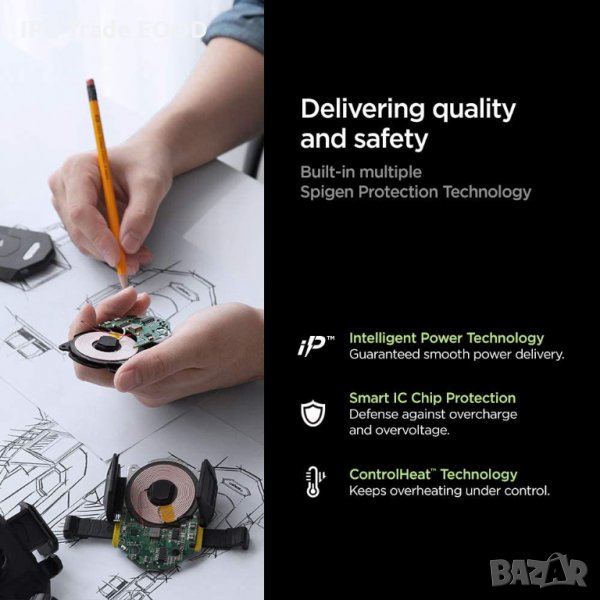 - Технология iP: IP технологията на Spigen идентифицира вашите устройства и осигурява оптимален ток на зареждане на най-безопасната максимална скорост