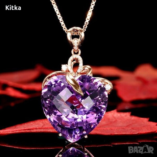 Колие с камък аметист. Форма сърце.Цвят лилав. Позлатен 18 ct.