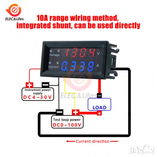 Диапазон на измерване на тока: DC10A (режим на дисплея 0.000A~10.00A)