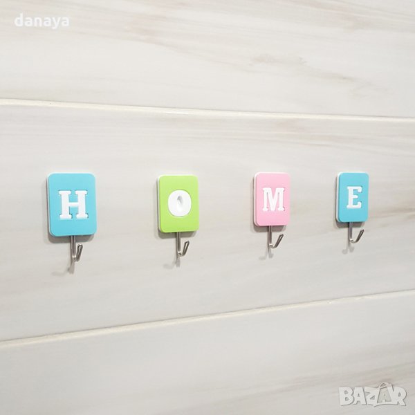 Комплект от 4 броя лепящи закачалки с 4 буквички, така обичани – HOME. Можете да ги залепите в банята, в кухнята, в коридора или навсякъде другаде в дома. Издържат на натоварване до 2 кг всяка. Цветни и свежи – ще създадат настроение във всеки дом. Не е нужно специален монтаж – просто залепяте върху гладка повърхност и готово!