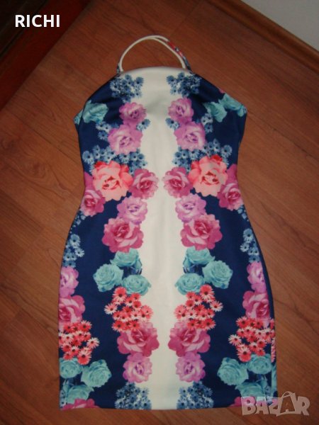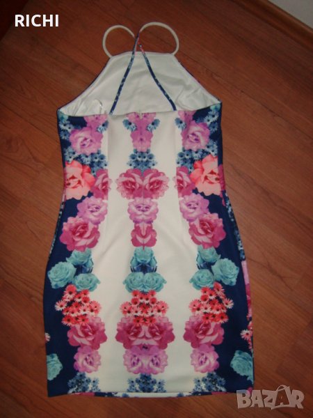 GUESS коктейлна рокля на цветя - Роклята е нова със свален етикет. Елегантен модел с красив принт на цветя и отворен гръб. Модела е с подплата и затваряне с цип отзад. Материята има еластичност. Размер М.