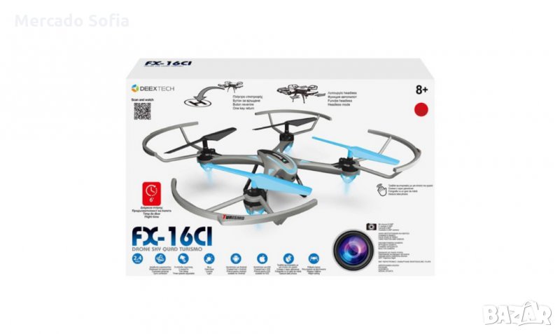 Дрон с ключ за връщане, функция без глава, корекция на жироскоп, 3 нива на скорост, регулиране на височината и светлина. Подходящ е за Android и iOS. Също така има възможност да прави снимка с движението на едната ръка, има 5 канала и 6-осен жироскоп. Време за зареждане 70-100 минути, продължителност на полета 6 минути и обхват на управление 60-80 метра. Съдържа USB кабел за зареждане, акумулаторна батерия със защита срещу презареждане и 3 нива на скорост. Работи с 1 тип батерия 3.7V 380MAH за Drone (включена) и 6 батерии тип AA за контролера (не е включена). Размери: 31.7x31.7x9 cm