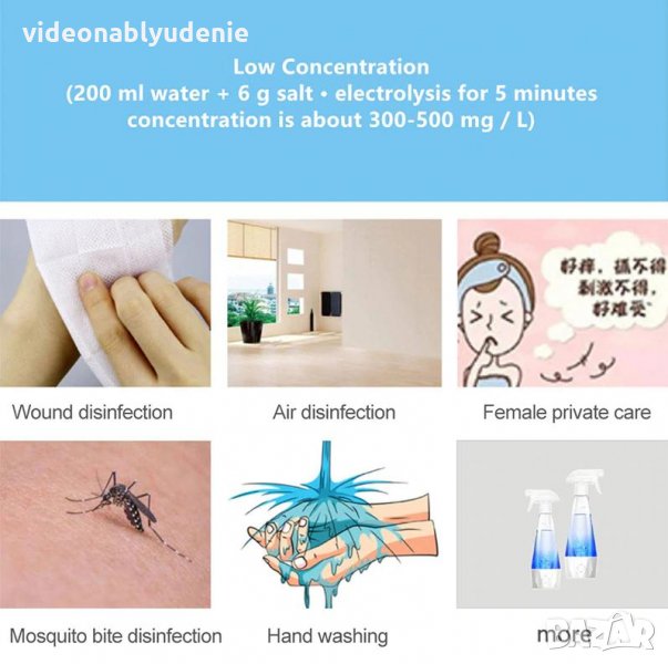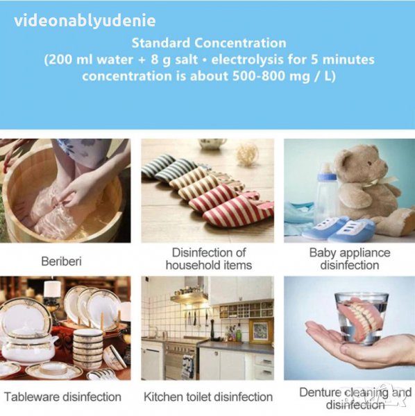 * Ниска концентрация - в 350 мл вода поставяте 10 грама сол и уреда ще електролизира за 10 минути разтвор с концентрация около 300-500 мг/л