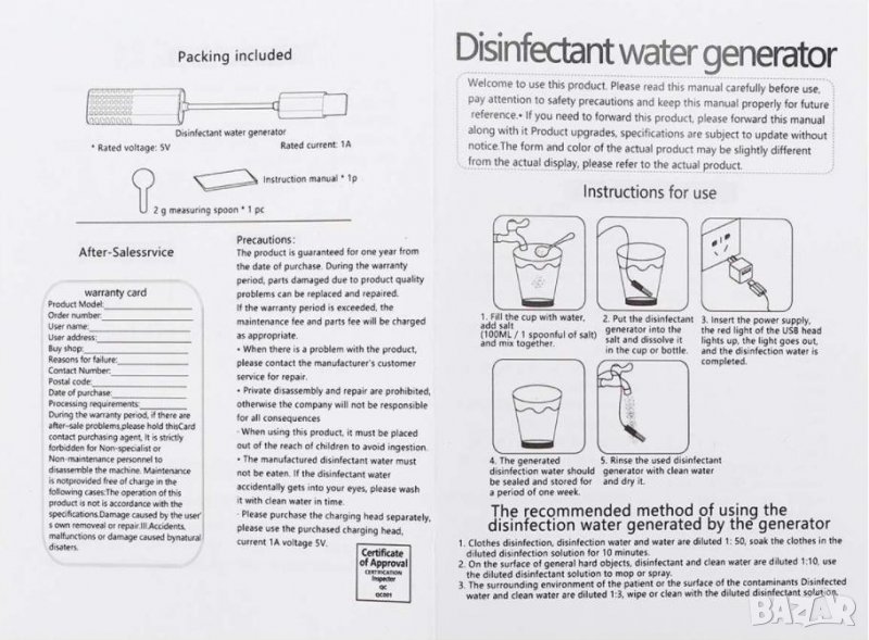 Капацитет: поставя се в до 500 мл вода за едно генериране и сол според нуждите от концентрация (пояснено е най-долу)