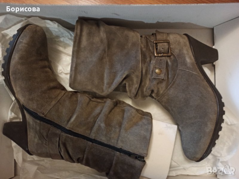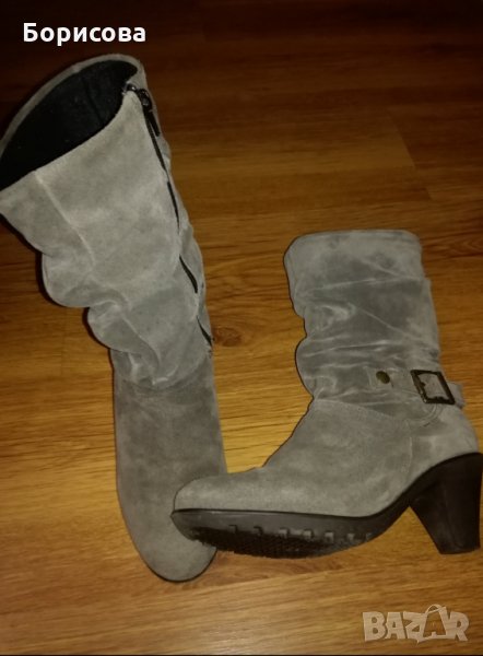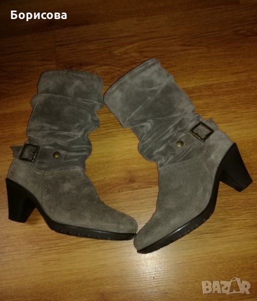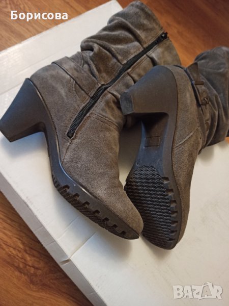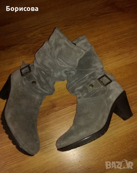 Ботушите са изработени от естествен велур, сиво-бежов цвят, номер 38. В отлично състояние са, обувани са броени пъти. Нямат протрито, захабено или скъсано. Ходилото е излято, токчето е високо около 5-6 см и е много удобно и устойчиво. Подметката е с грайфер и не се пързаля.