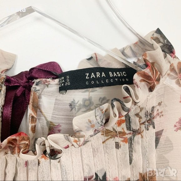 Флорална шифонена блуза ZARA с дълги 'балон' ръкави, къдрава 'столче' якичка, еластичен подгъв и маншети и сатенени панделки, връзващи се на тила.