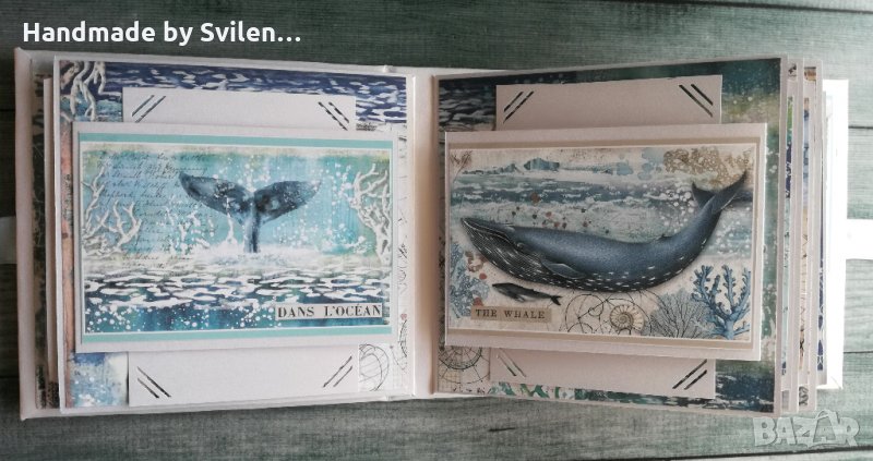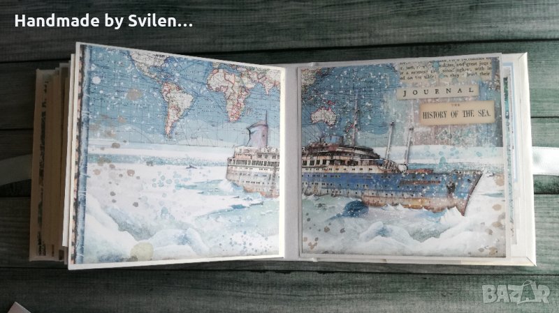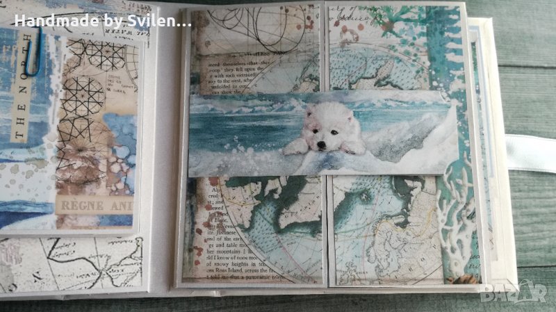 Ръчно изработен интерактивен албум Размер 17/17/7 см. Състои се от шест листа, като всеки лист е и джоб за допълнителни снимки.Може да побере около 70 снимки с размер 9/13 см,
