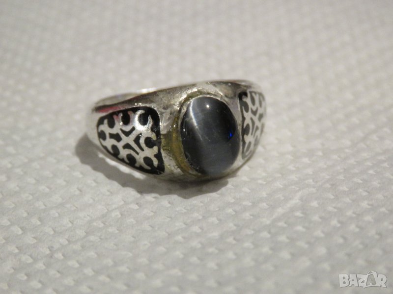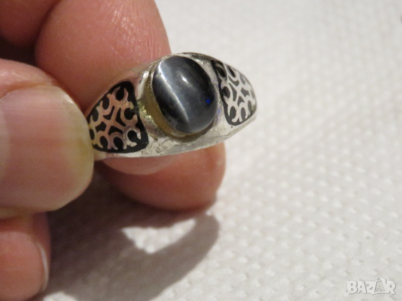 Стар красив мъжки сребърен пръстен с камък котешко око и ниело сребро