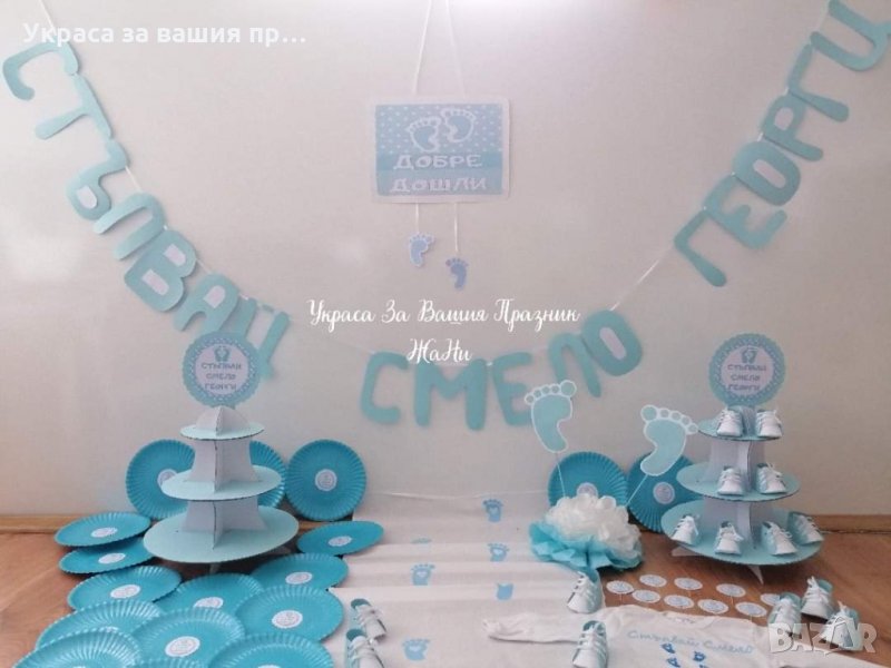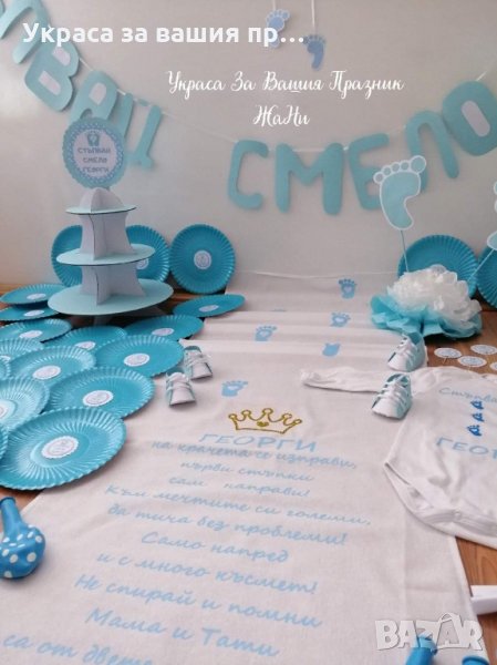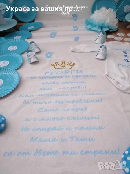 Украса за празника на първите стъпки на вашето дете.Комплекта може да включва каквито аксесаори желаете и може да бъдат изработени в желаните от вас цветове * надпис *платно/пътечка за прощъпулник *боди с името на детето *покани *подаръчета за гостите -3Д кецове -3Д пантофки -кутийки за бонбони -топери със снимка или надпис *топки от тишу *цветя от тишу за украса на масата *украса за маса *табела за врата *рингове за салфетки *стойка за мъфини и сладки *формички и клечки за мъфини
