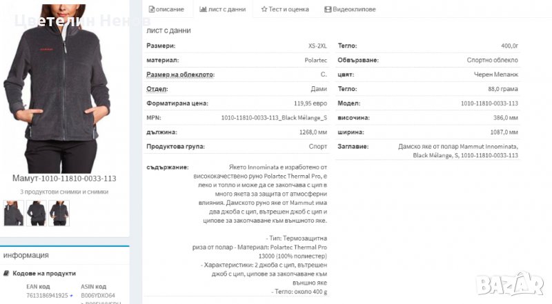 Дамско яке от полар Mammut Innominata, Black Mélange, S, 1010-11810-0033-113 Топъл, удобен полар. Якето Innominata Advanced ML е много топъл среден слой, изработен от високотехнологичен материал Polartec® Thermal Pro®. Руното е много плътно изтъкано и въздухът се съхранява в тъканта с висока купчина. Резултатът е меко, удобно яке с отлични изолационни свойства и изключително съотношение топлина / тегло. Благодарение на интелигентните ципове с цип, Innominata може бързо и лесно да се използва като подплата за нашите якета с твърда обвивка с цип.