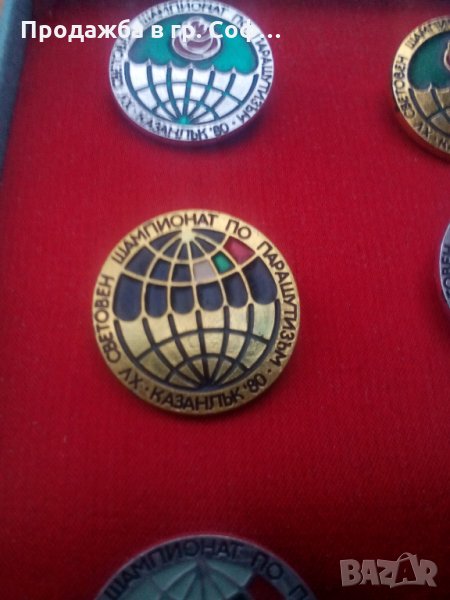 Колекция 6 броя значки в кутия от 15 -ти Световен шампионат по парашутизъм Казанлък 80 г..