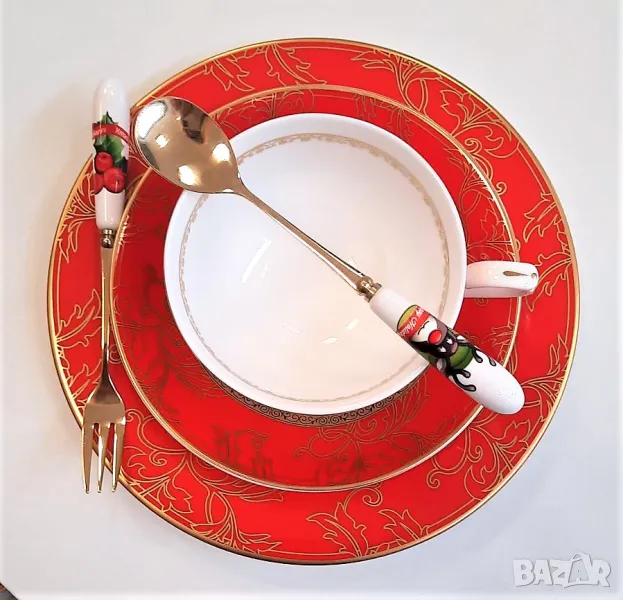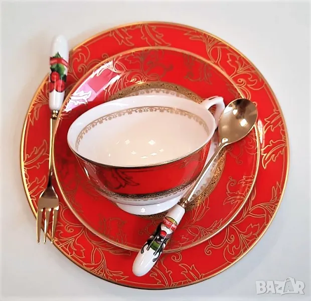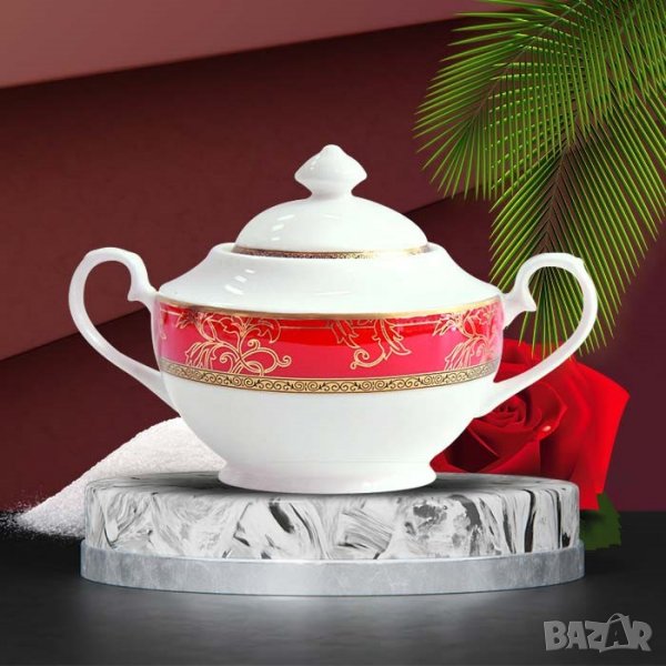 Луксозен, червен сервиз за хранене със златна подглазурна декорация и гравиран златен кант, здрав и устойчив, костен порцелан