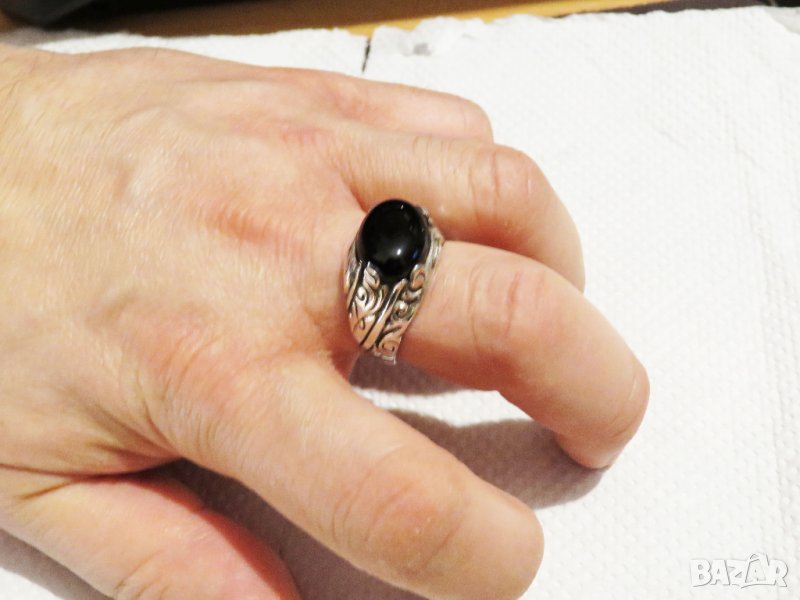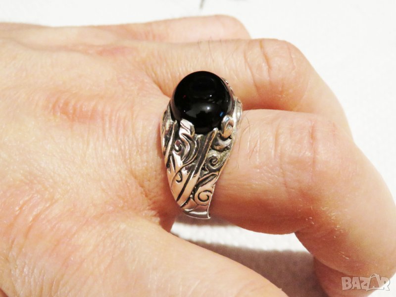Стар красив мъжки сребърен пръстен с голям красив камък черен оникс и прекрастна изработка сребро