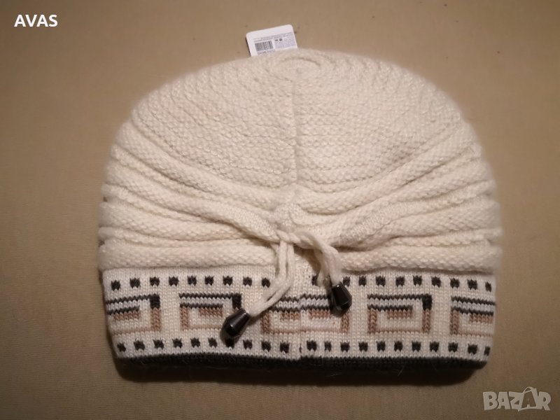 Нова зимна дамска шапка светло бежово/екрю, с широк борд с кафяви орнаменти, с висящи връзки отзад, двуслойна натурална ангора + вълна, много топла и качествена.