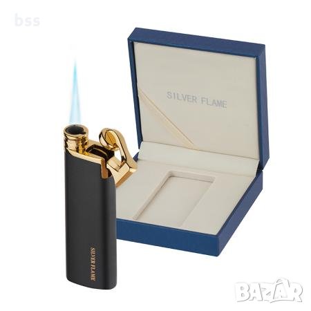 Описание: Тънка елегантна черна запалка със златиста периферия и надпис „ Silver Flame “. Получавате запалката с гаранционна карта и луксозна подаръчна кутия с размери – 10/10/3,5 см. . Размери на запалката: 2,5/8 см. Ветроустойчив пламък.
