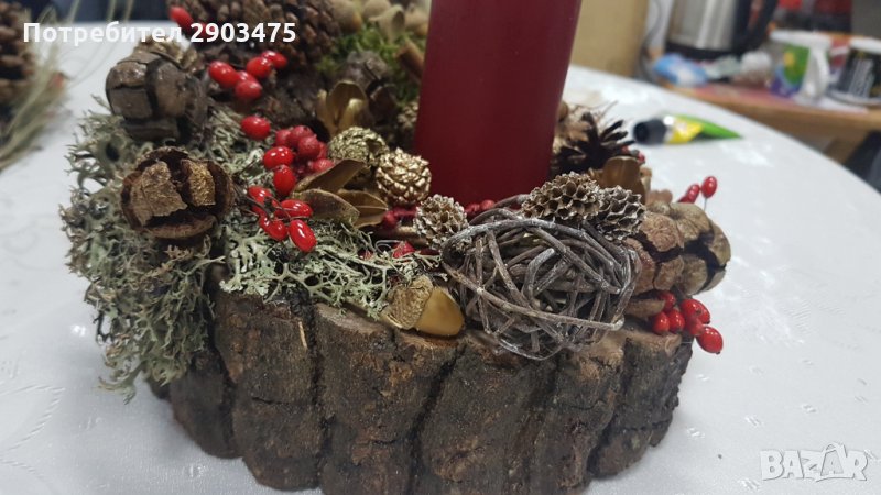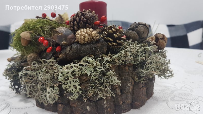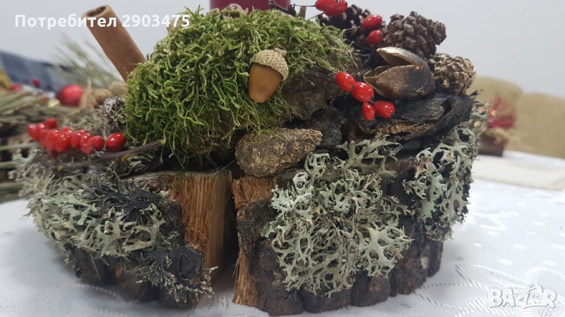 Ръчно направен свещник от дърво с естествени материали. Диаметърът на дървото е 22 см, като материалите са предварително обработени и подредени в аранжировка за една красива декорация за нечий стилен и уютен дом. Подходящ подарък за близки и приятели ценящи уникално и ръчно изработени предмети от естествени материали. Всички наши продукти са собствена продукция и са изработени в единични неповтаряеми екземпляри. БЕЗПЛАТНА ДОСТАВКА до офис на Еконт!