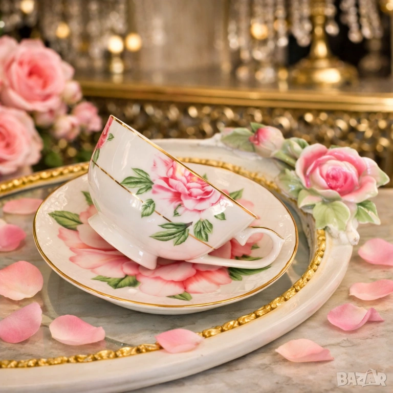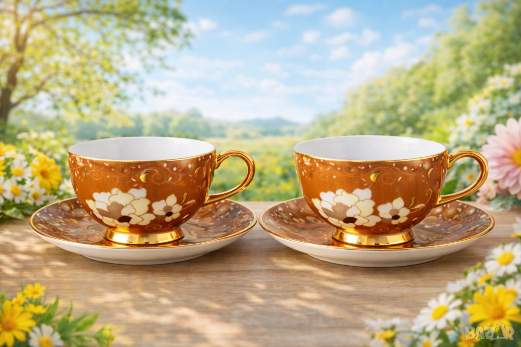 Луксозен комплект чаши с чинийка от висококачествен костен порцелан с червен, цветен декор, ръчно поставени златни точици и златен кант.