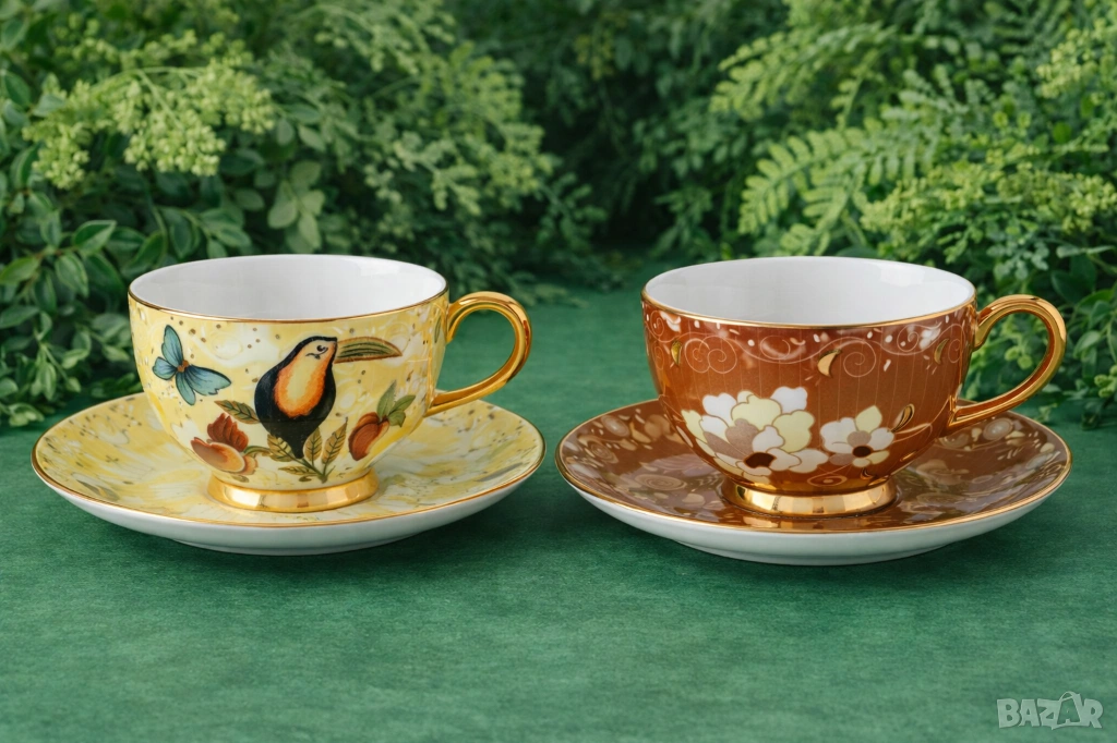 Красив комплект от две чаши с чинийка от костен порцелан подходящи за кафе, чай или капучино.