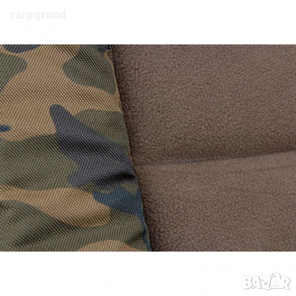 Изключително удобният стол разполага с плътен матрак с мек полар в средата на седалката, допълнително подсилване в горната част на гърба, 4 регулируеми крака, Fox Camo polyester по края на седалката, регулируема облегалка, здрава стоманена рамка и подлакътници с неопренова облицовка.