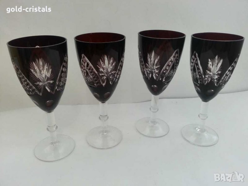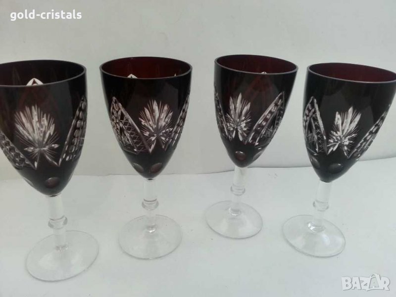 Кристални чаши цветен кристал рубинено червен кристал ръчно гравирани ръчна изработка 4бр -445лв има пета чаша подарък с забележка и още 6бр-599лв сервиз комплект сет лот ретро арт декор винтидж колекция стари антикварни предмети обзавеждане за дома и семейството подходящи за подарък за ценители и колекционери