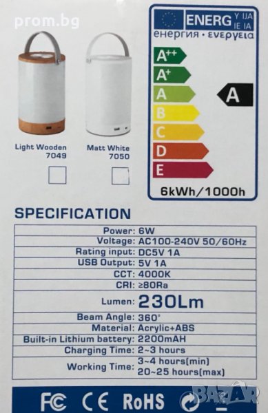 LED акумулаторна, къмпинг лампа Power bank, 4000K, 6W, внос от Германия. Мощност: 6W; напрежение: 100-240V;клас водоустойчивост: IP20, размери: ø 110x173mm; 230 lm светлинен поток; Цветна температура: 4000К; Светлинен лъч: 360°; Материал: Акрил, ABS; Цвят: бял; Живот на лампата: 20000 часа; Енергиен клас: A; зареждане с USB 5V, включен е USB кабел (без адаптер); Тегло на артикула: 472 g. Вградена Lion батерия 2200 mAH, която може да се използва за power bank (зареждане на мобилни устройства).