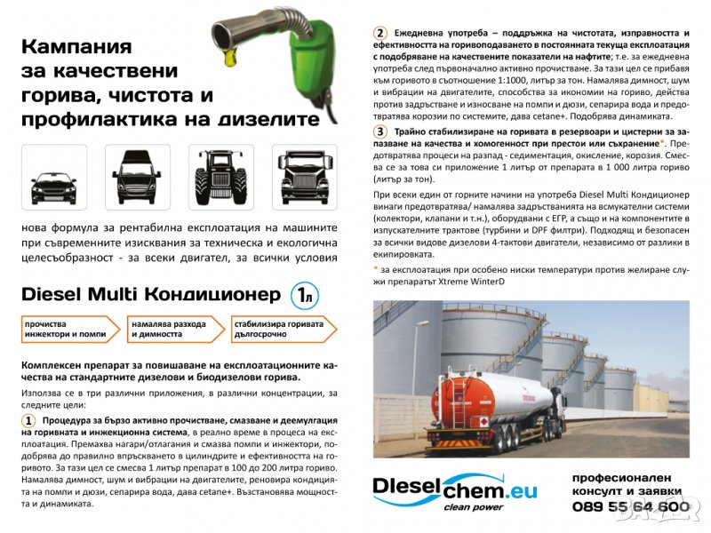 Поръчайте и се консултирайте на телефон 0893 49 39 69 с професионалисти в дизеловата химия, с европейска квалификация и 20-годишен опит. Можете да видите още в сайта ни