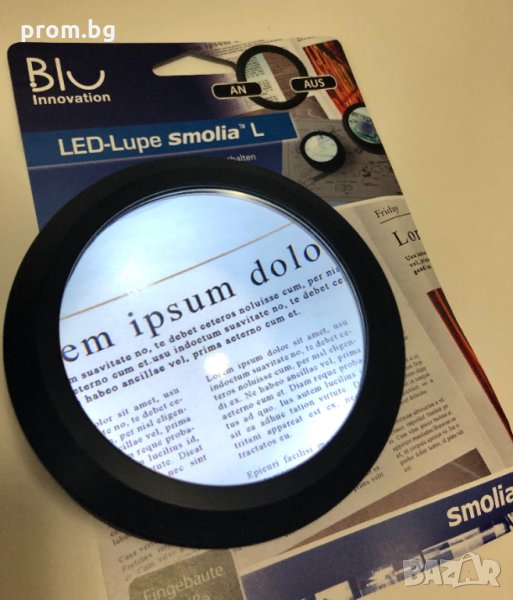 Лупата е с Ø 69 mm, 3.0x,. Осветяване с 3 бели светодиода, автоматично изключване след 10 мин. Работи с 2 батерии (CR2016), включени в комплекта( допълнително са включени и 2 резервни батерии). Време на работа до 12 часа. Диаметър на обектива: Ø 69 мм леща; Диаметър на корпуса: Ø 92 мм; Височина: 50 мм; Тегло: 135 гр. Материал ABC, удароустойчива пластмаса. Стойката е с гъвкаво рамо, Smolia. Размери: основа на стойката: диаметър 98 мм; поставка за лупата: диаметър 96 мм, височина 24 мм; обща височина 281 мм. Тегло 650 гр.