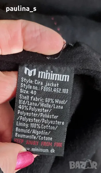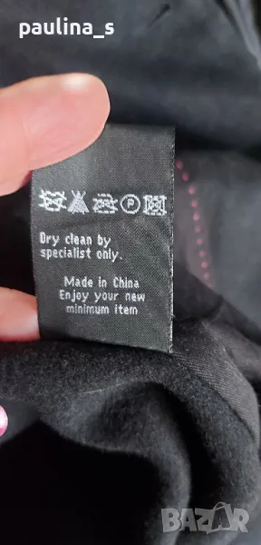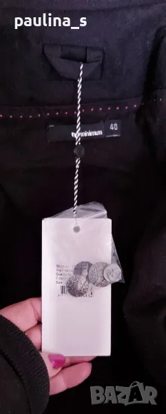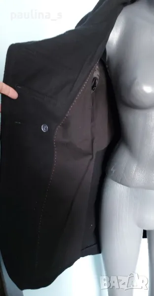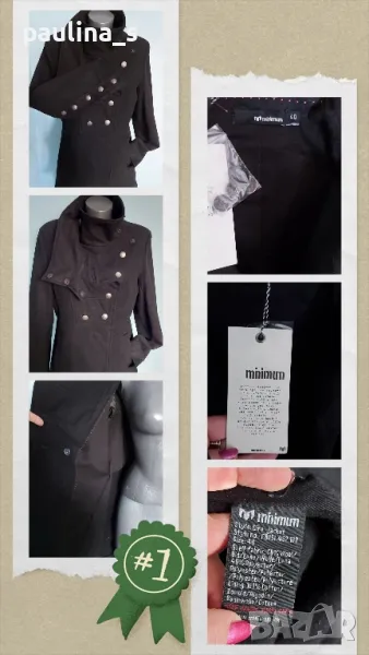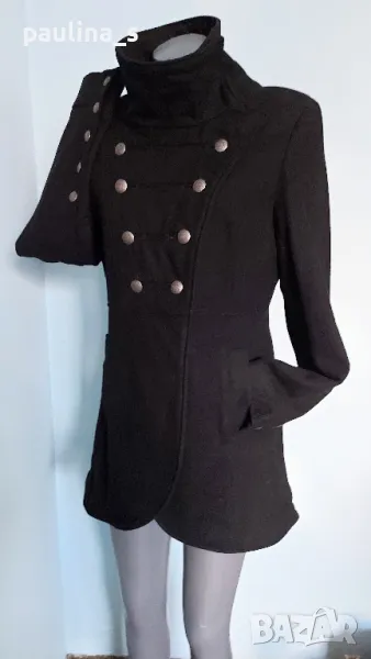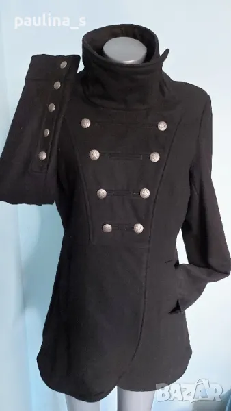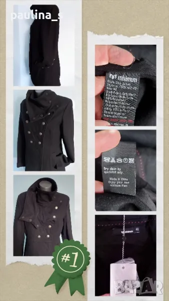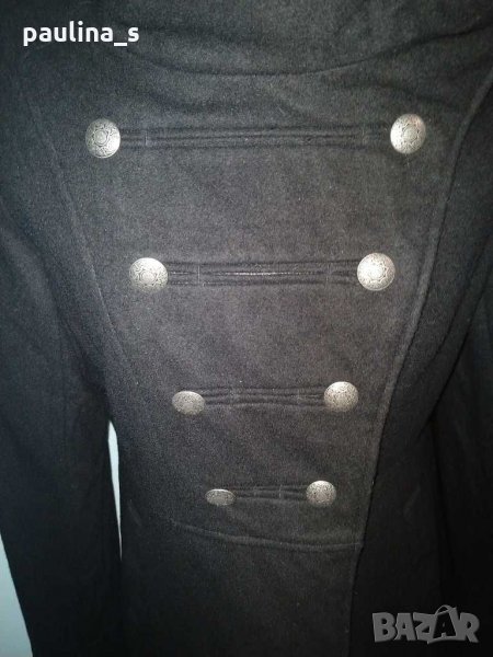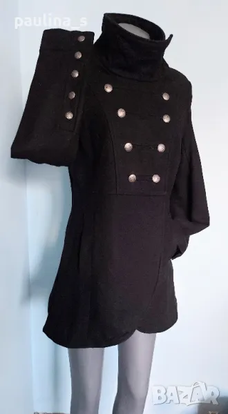 1. L / XL "minimum". Цената е крайна 124,99лв / 63 евро. Уникално палто модел Милитъри / "Генералски мундир" с вталяване и издължена задна част, която е с ластичен набор вътре в подгъва. Платът е 60% вълна и 40% полиестер. Сребърни орнаментирани копчета отпред, на ръкавите и отзад на коланната платка. Хастарът е памучен, резервни копчета.