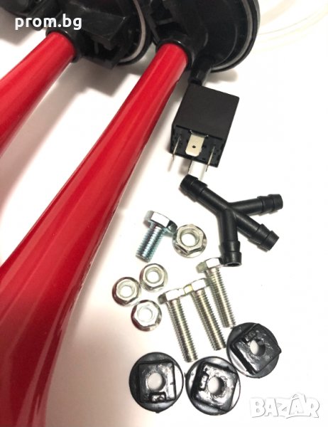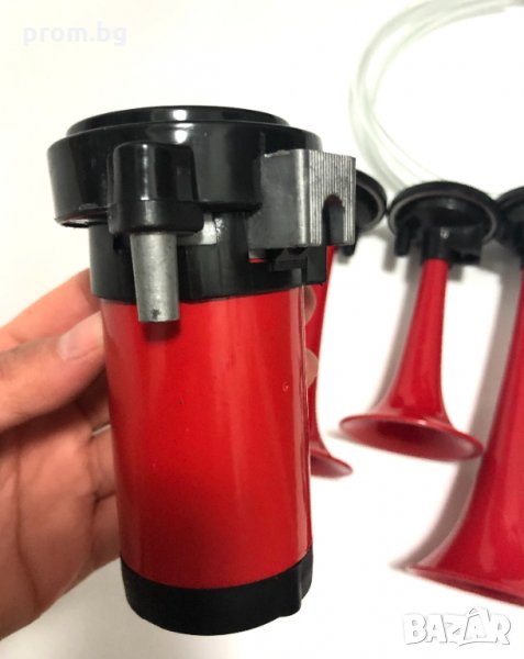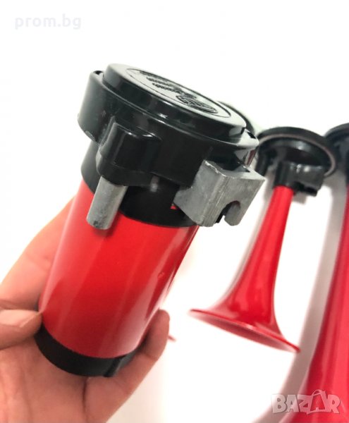 въздушни тромби, клаксон, фанфари, 12V, 118dB (A), Hella Германия. Честотен обхват: 780Hz / 820Hz / 880Hz с три тръби, електрически-пневматични. Супер силен пневматичен, тритонален клаксон. Мощен звук, надвишаващ силата на обикновените клаксони. Консумирана мощност: 240W. В комплекта са включени: 1 брой компресор, пневматичен маркуч, 3 броя тромби с крепежни планки и болтове. Размери на опаковката: Д х Ш х В - 29,5 х 9 х 25,5 см