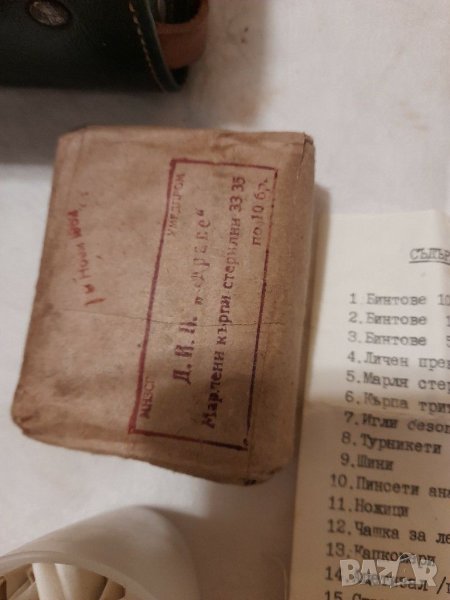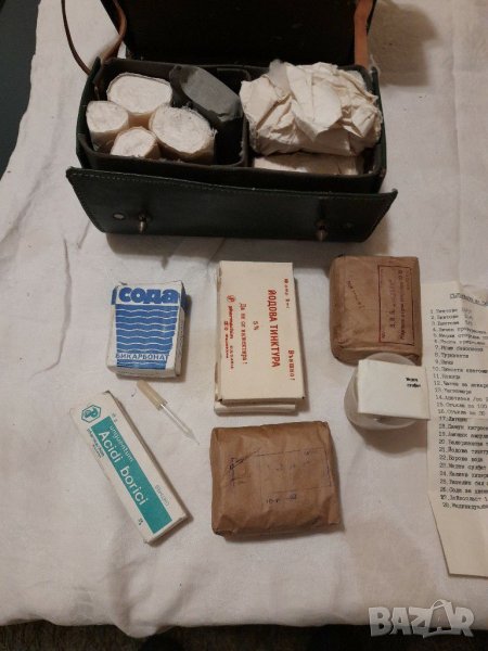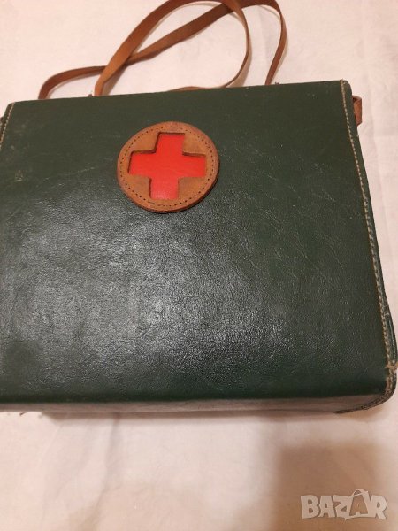 Стара медицинска кожена чанта с всички медикаменти и превързочни материали към нея с маркировка от 1982год. Състояние видно на снимките много запазена и почти никакви следи от употреба въпреки възрастта си.Цената не подлежи на коментар. За ценители и колекционери на винтидж предмети.
