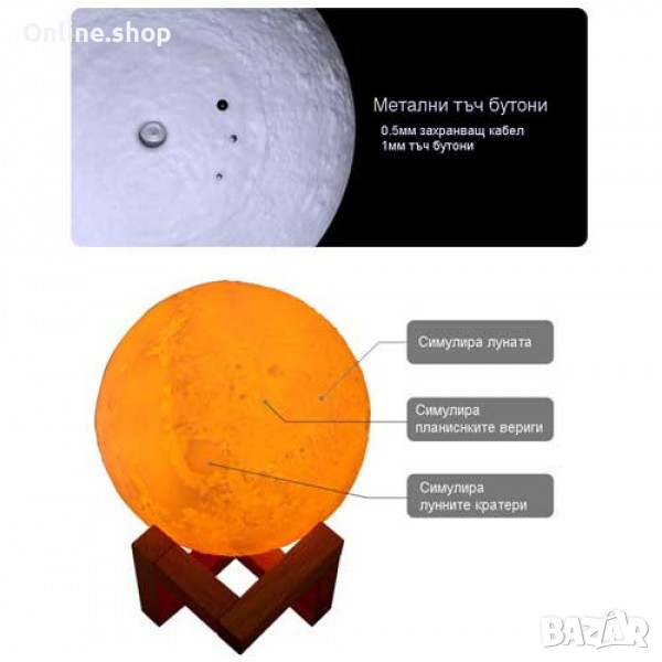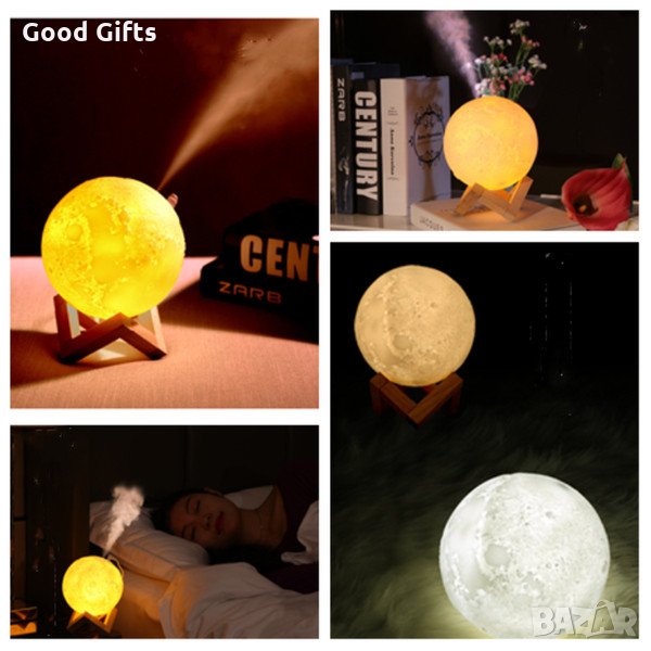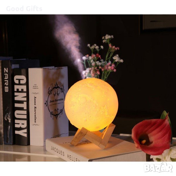 Нощна лампа тип дифузер и овлажнител свети в 4 цвята. С реалистичната си 3D форма копира истинския релеф на Луната, и лампата преминава през всички нейни фази с 4 сменящи се режима на светене чрез докосване. Светлината и е мека и ненатрапчива. Осигурява приятна, успокояваща атмосфера.