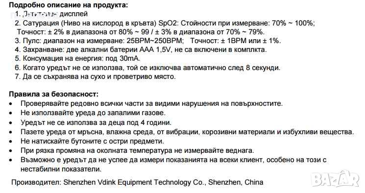 Бърза проверка на сатурацията и пулса! Оксиметърът осигурява бърза и безболезнена проверка на здравния статус, като чрез него може да проследите нивата на кислород в кръвта и сърдечната честота (пулс). Помага за ранното откриване на здравословни усложнения и респираторни заболявания. Лесен и удобрен за употреба.
