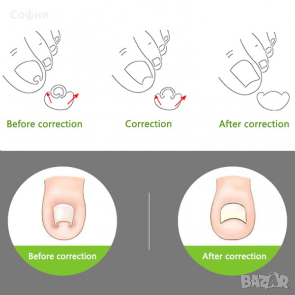 - Препоръчително е носене на хлабави обувки, докато коригирате правилната посока на растеж на нокътя.