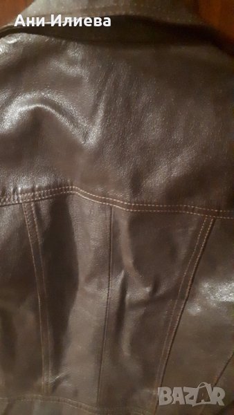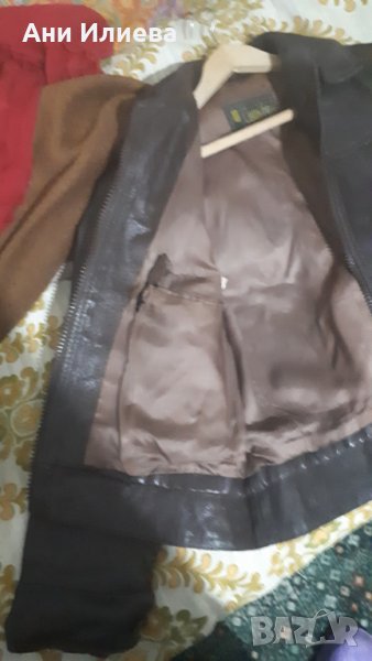 Естествена много плътна кожа. Тъмнокафяво. Носено, запазено. Няма скъсано, протрито отвън. Има само скъсано на хастара отвътре - последната снимка.
