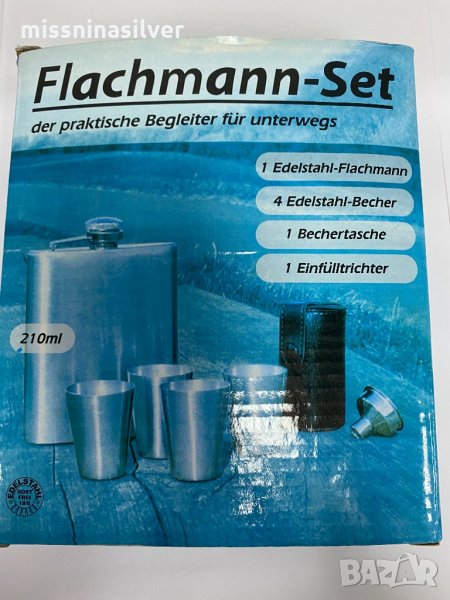 Комплект манерка с 4 чашки от неръждаема стомана. Опаковано е в кутия. Идеален подарък за мъж