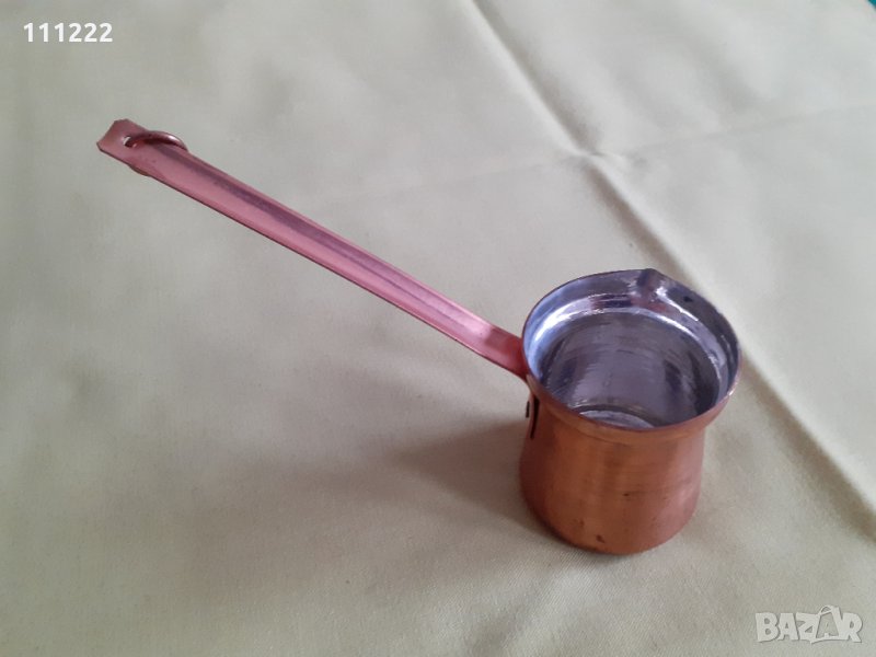 2. Малко медно джезве неупотребявано за едно кафе или за греяна ракийка; диаметър на дъното 4.5 см; диаметър в горната част 5 см; дълбочина 6-6.5 см; дължина на дръжката 12 см;