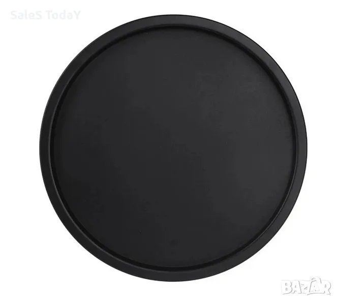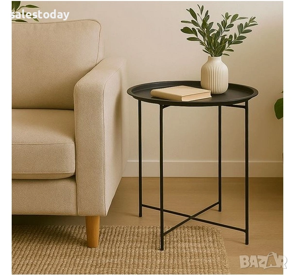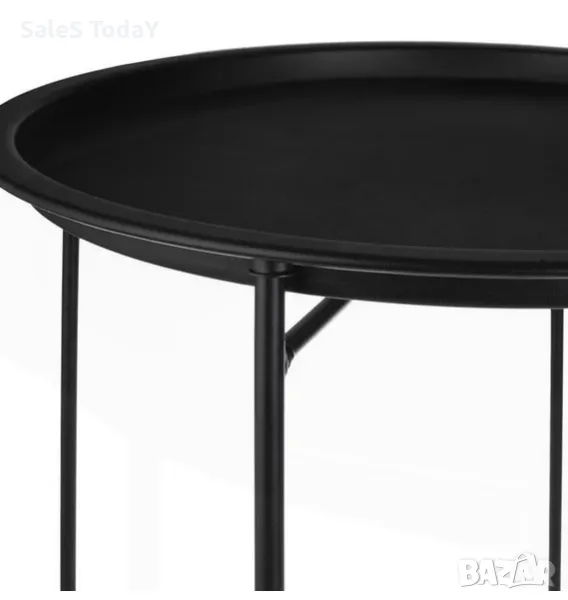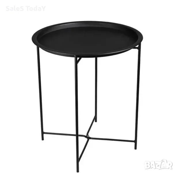 Тя е изработена от метал. Масичката е черна на цвят и е чудесен начин да добавите стил и функционалност към вашето вътрешно пространство.Кръгъл плот с табла, който е идеален за поставяне на напитки, закуски или други предмети.