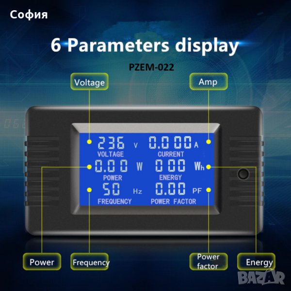 Контролен уред, който измерва и показва напрежението на мрежата, токът в ампери, мощността във ватове и консумираната енергия ватчасове/киловатчасове. С възможност за вграждане в табла на машини, апартаментни, етажни и промишленитабла и др. Осветлението на дисплея е в синьо с възможност за изключване.