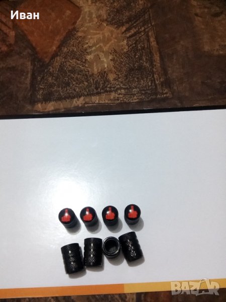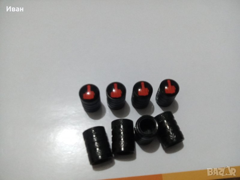 Цена за 4 броя черни метални капачки за вентили на гуми с емблеми на червена ръка със среден пръст - 4.90 лв.
