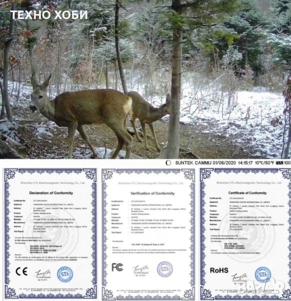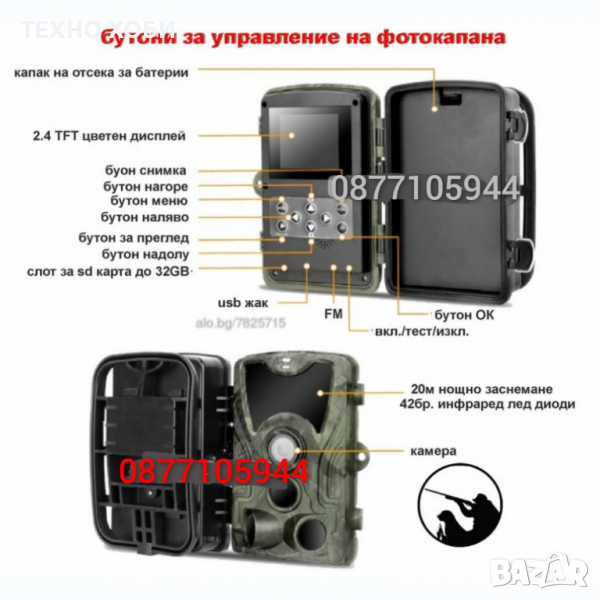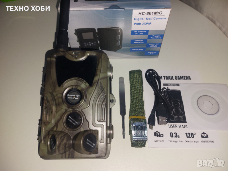 ловния периметър. Подходяща е и за Пчелини,овощни градини,следене на популацията на различни животни. Разполага с PIR сензор, който улавя движението пред обектива. Можете да зададете на устройство да снима само в определени часове, като през останалото време ще бъде неактивно. Кадрите ще бъдат с високо качество независимо дали снимате през деня или през нощта. Благодарение на IR-инфраред диодите ще получите кадри с високо качество през тъмната част на ноща. Снимките и клиповете може да получите по два начина, като и за двата Ви трябва СИМ карта с активиран интернет Първият е чрез MMS, за което трябва да активирате и MMS услуга от мобилния оператор. Вторият вариант е по-бюджетен и именно за това и по-предпочитан, можете да получавате кадрите по имейл. При този избор Ви трябва карта само с интернет. Устройството може да бъде нагласено да прави снимки, видео или и двете като ги редува. Има Time Lapse функция, която позволява да настроите интервали за правене на снимки с режима, съответно през 5, 30 или 60 мин. Всички кадри се съхраняват на SD карта с памет, която може да бъде с големина до 32 GB. Не на последно място е корпусът, който е водоустойчив, така няма да се притеснявате, че камерата може да се повреди при дъжд и влага. Също така е в камуфлажен цвят, който се слива много добре с природата• Сензор: 5 МР CMOS